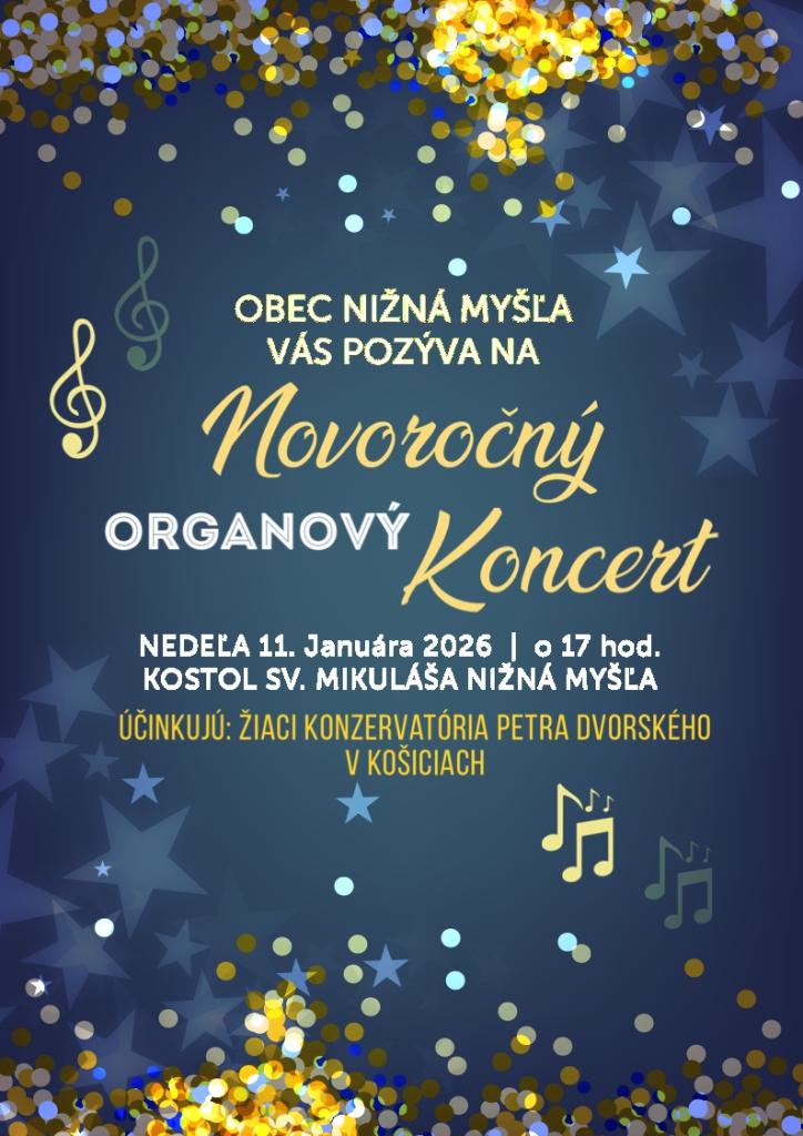 Obec Nižná Myšľa Vás srdečne pozýva na Novoročný orgánový koncert, ktorý sa uskutoční dňa 11.01.2026 o 17.00 hod. v kostole sv. Mikuláša v Nižnej Myšli.